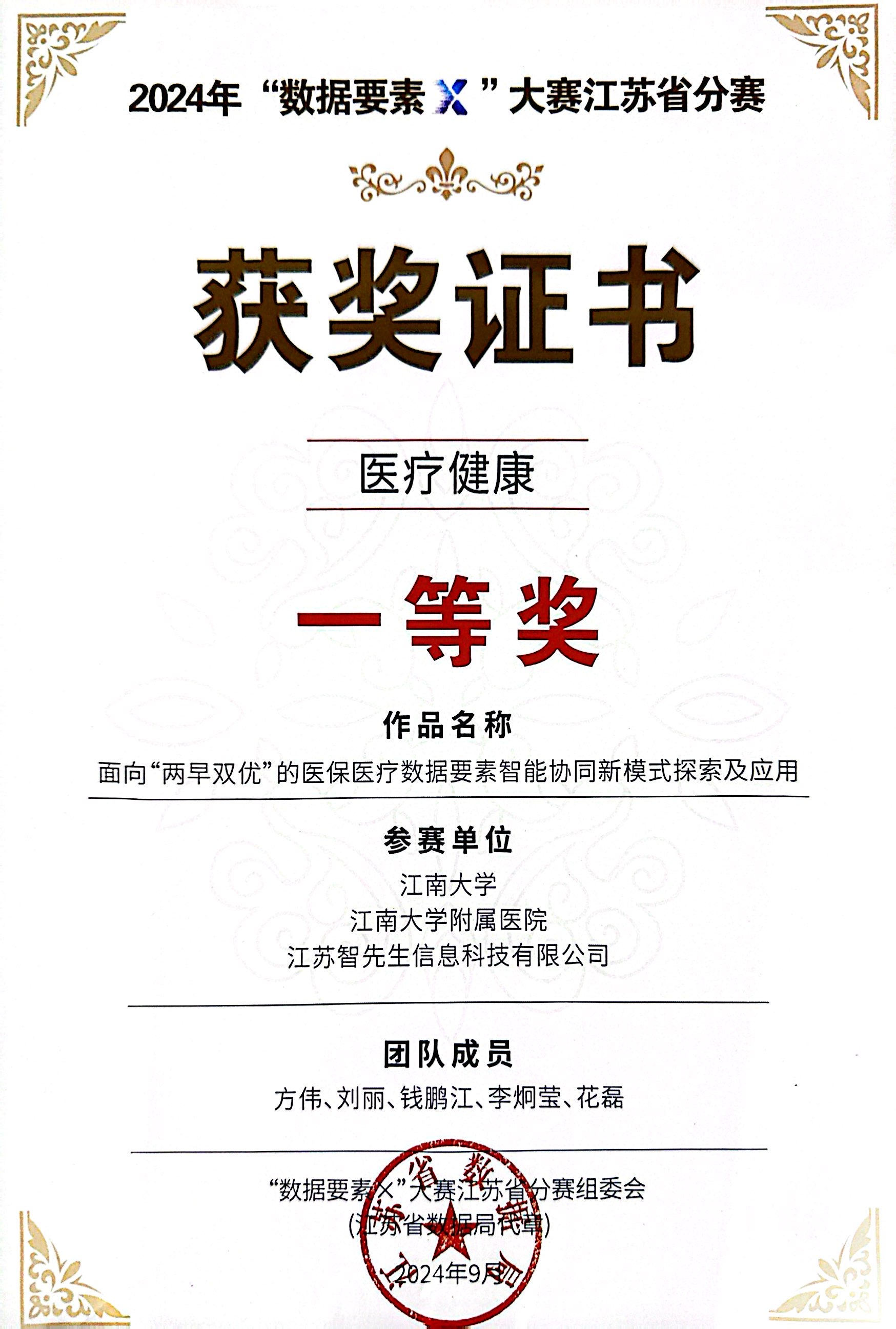 10月18日,由PA视讯集团官网、PA视讯附属医院与江苏智先生信息科技有限公司联合组成的创新团队(简称江大创新团队,成员包括方伟、刘丽、钱鹏江、李炯莹、花磊等),在江苏省数据局举办的2024年“数据要素X”大赛江苏省分赛中以卓越的表现脱颖而出,荣获一等奖。江大创新团队提出的面向“两早双优”的医保医疗数据要素智能协同新模式,获得了评委们的高度认可和一致好评。