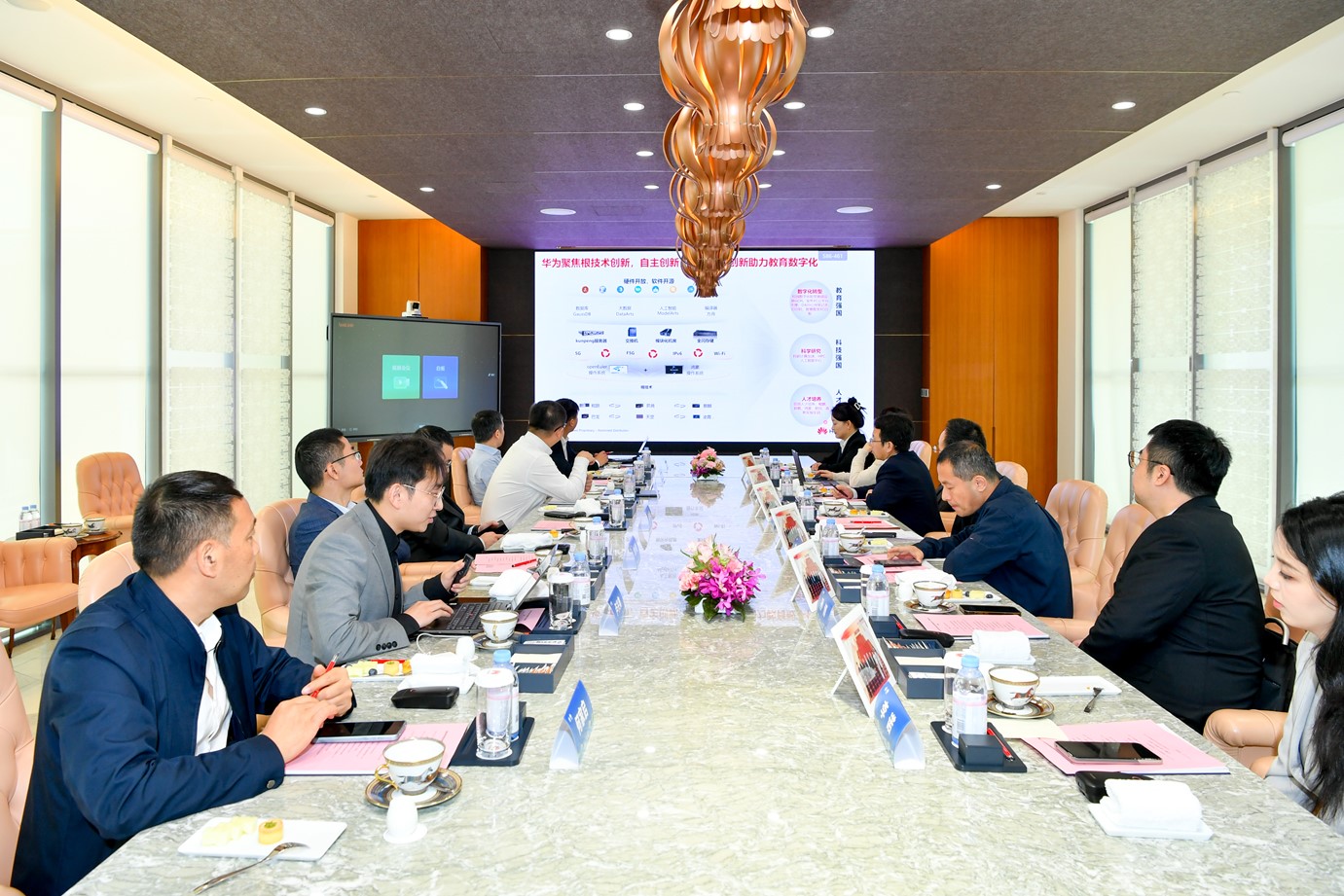 赵祎鑫对堵国成一行的到访表示热烈欢迎。他表示,华为通过产业融合、产教融合的创新人才培养模式,构建了开放合作共赢的人才生态。与教育部深度合作,建立智能基座产教融合协同育人基地,培养更多适配国产信创自主可控的人才。在人才培养和人才转化方面,采取双重驱动策略,建立了ICT公司、大赛人才双选、书籍和认证体系等一系列平台和项目。
