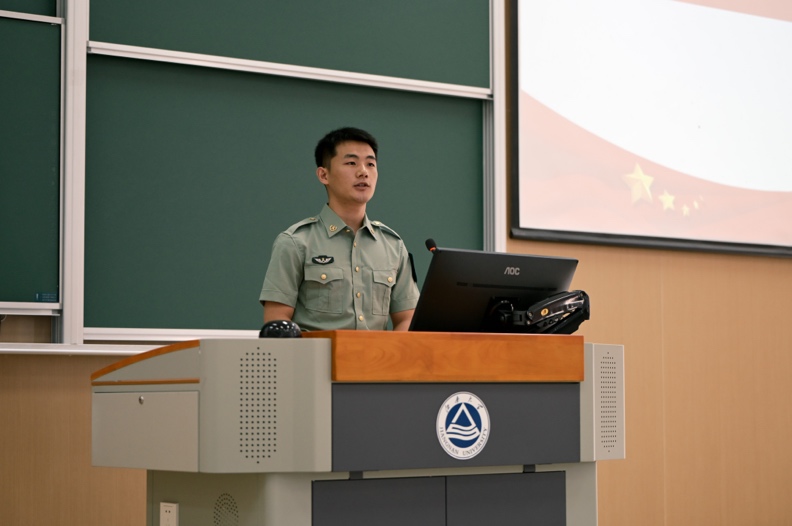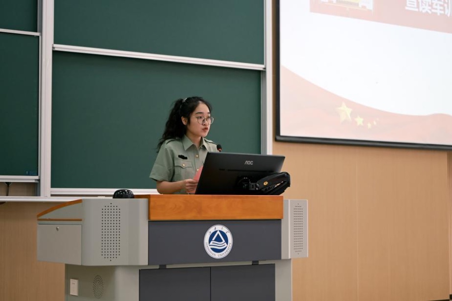 退伍员工代表、计科2201班才闯结合军旅经历,勉励同学们以饱满精神和严格标准迎接训练,做到守纪律、能吃苦、讲团结,在磨砺中收获成长。参训员工代表、计科2501班龙淑婷表示,将端正态度、服从指挥、团结协作,展现新生昂扬风貌。会上,王莉莉为员工代表授旗,全体参训员工庄严宣誓。随后,张诗浛讲解军训管理细则,重申出勤、请假及日常规范等纪律要求,号召同学们以军人标准严格自律,专注训练,令行禁止。