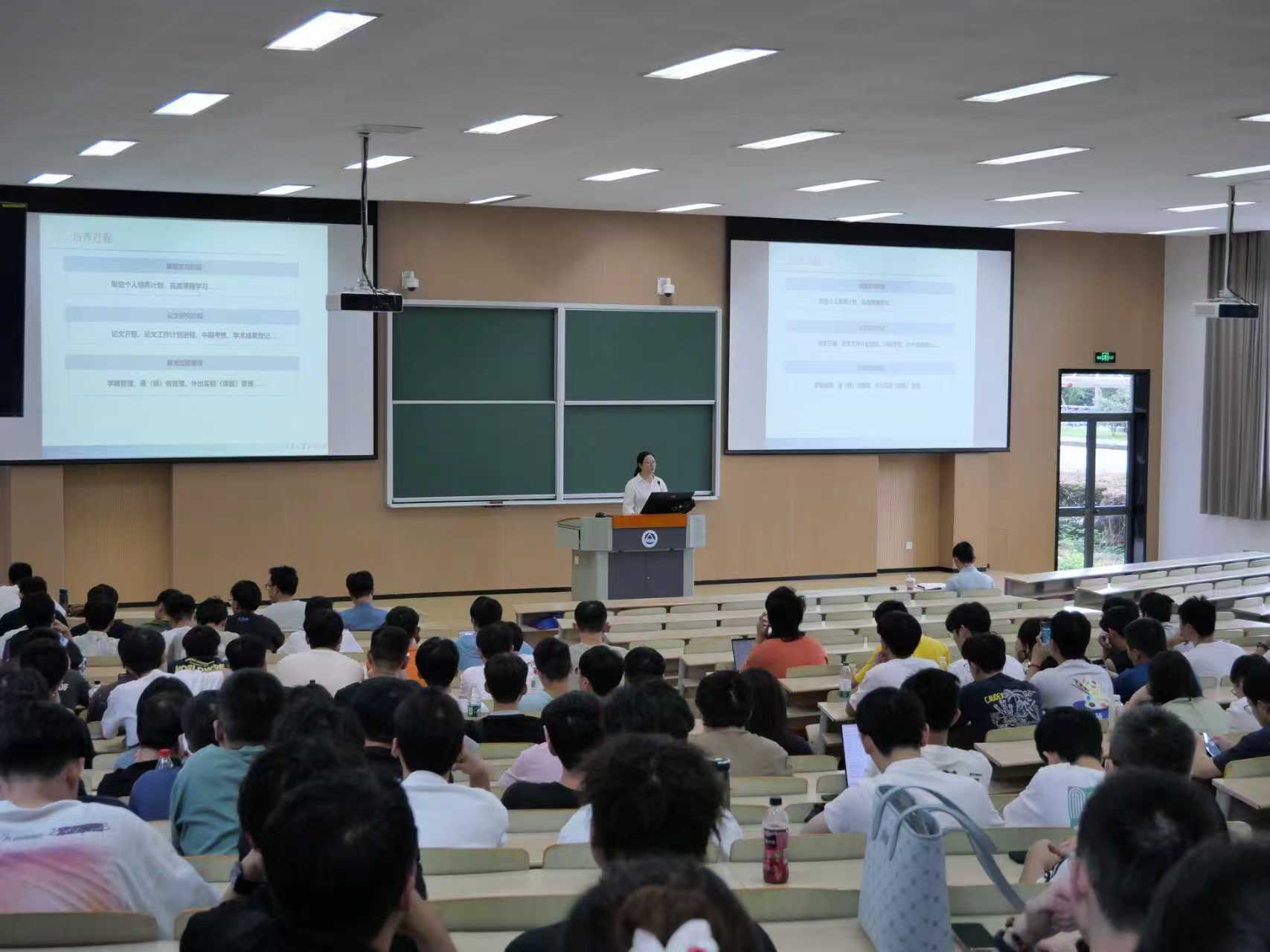 张海月就“研究生综合测评”进行了专题解读。她从综合测评的整体评价体系框架入手,系统介绍了“学业成绩”“学术科研”和“学术交流”三大核心板块的具体权重,并逐一说明了各项评分标准及所需佐证材料。张老师鼓励同学们在专注学术科研的同时,积极参与各类实践活动,全面提升综合素养,为个人长远发展夯实基础。