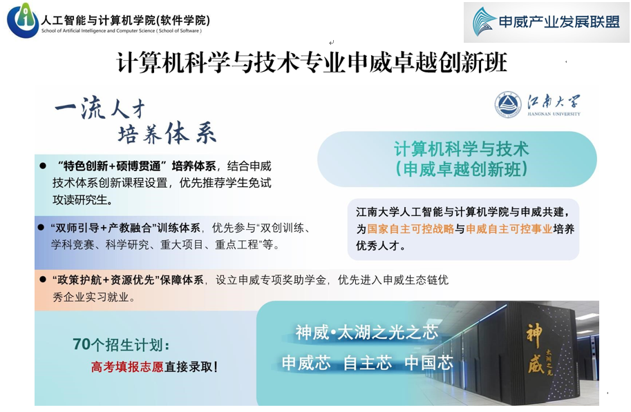 神威·太湖之光的 CPU 是申威 26010 众核处理器,是拥有自主指令集和关键核心技术、完全自主可控的中国芯,摆脱了 CPU 芯片领域的“卡脖子”问题。申威 CPU 的技术体系值得我们去系统的学习,并为她的持续发展做出应有的贡献。为此,在今年的本科招生中,PA视讯将专门开设计算机科学与技术专业的申威卓越创新班,面向全国招收70名左右的优秀学子。