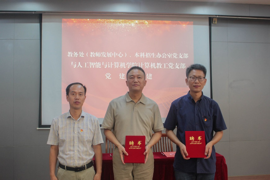 签约仪式结束后,还举行了教学观察员聘任仪式,聘任夏鸿斌、毛力、蒋敏、杨金龙为教学观察员,并由教务处副处长吴宝锁向四位老师颁发聘书。本次活动还邀请了人文公司陈明选教授为两个支部的党员开展了一次主题教育联学党课。