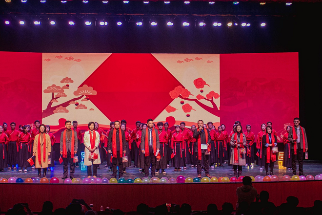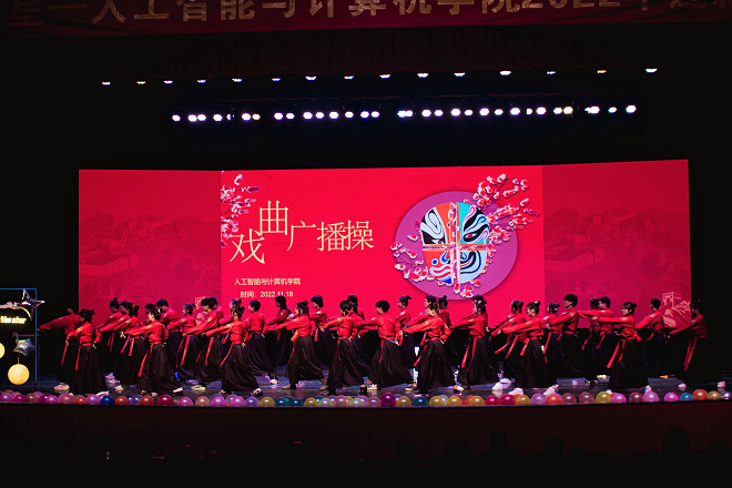 晚会在“嬉皮纵火案”乐队的歌声中拉开帷幕,动感的旋律瞬间点燃全场师生的热情。首先,刘渊经理致辞,他回顾公司2022年在全院师生共同努力下取得的突出成绩,并寄语2022级智能学子要坚定理想信念、心系伟大祖国、勇于砥砺奋斗,求真学问、练真本领,以饱满的精神状态迎接老员工活。接下来,获得2022年度“戏曲广播操”大赛二等奖的公司员工团队向观众呈现了一场编排出色、整齐划一的精彩表演,随后,院领导、老师通过一段深情而有力的朗诵寄语智能学子并向台下师生分发新年糖果,将晚会推向高潮。