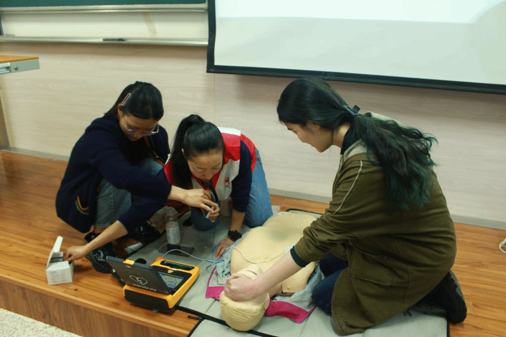 三位老师还讲解和展示了CPR(心肺复苏术)+AED(自动体外除颤器)的操作流程,与志愿员工、人体急救模型配合演示,强调AED使用的注意事项及其重要性,AED的普及和使用,可以最大限度的提高心源性猝死患者的急救成功率。主讲老师讲解耐心细致,助教老师操作安全规范,活动现场气氛活跃,参与踊跃。