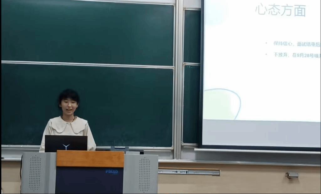 第二位是袁羽奕作分享,她成功保研至上海交通大学设计公司。袁羽奕是跨专业保研,她从为什么进行跨专业推免和判断自己是否适合跨专业保研两个方面和同学们进行了交流,同时她也分享了自己的求学经历以及在老员工涯中自己所取得的相关科研成绩。最后,她鼓励同学们要勇于尝试、在剩余的大学时光里努力提升自己。